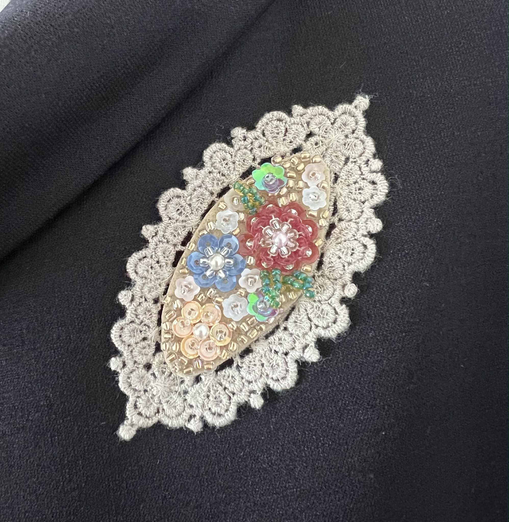 スパンコールのお花とビーズの葉っぱ刺繍し、レースのフレームと重ねることで、上品で華やかなブローチが完成します。