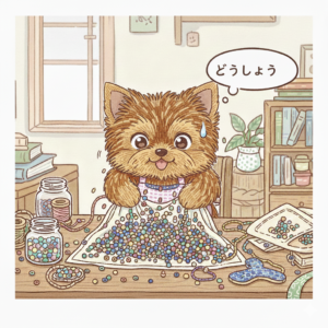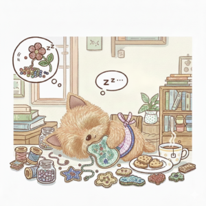 • 突然の「電池切れ」 集中力が切れると、場所を問わずその場で爆睡してしまいます。さっきまで泣きながら作業していたかと思えば、次の瞬間にはビーズに囲まれてスヤスヤ…。「爆睡」こそが彼女の唯一の回復手段です。