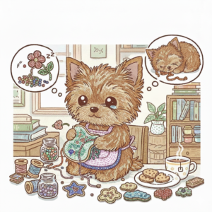 「しっかり者に見えて、実はほころびだらけ? 涙もろいビーズ刺繍作家」 ヨークシャーテリアの女の子。「つむぎちゃん」